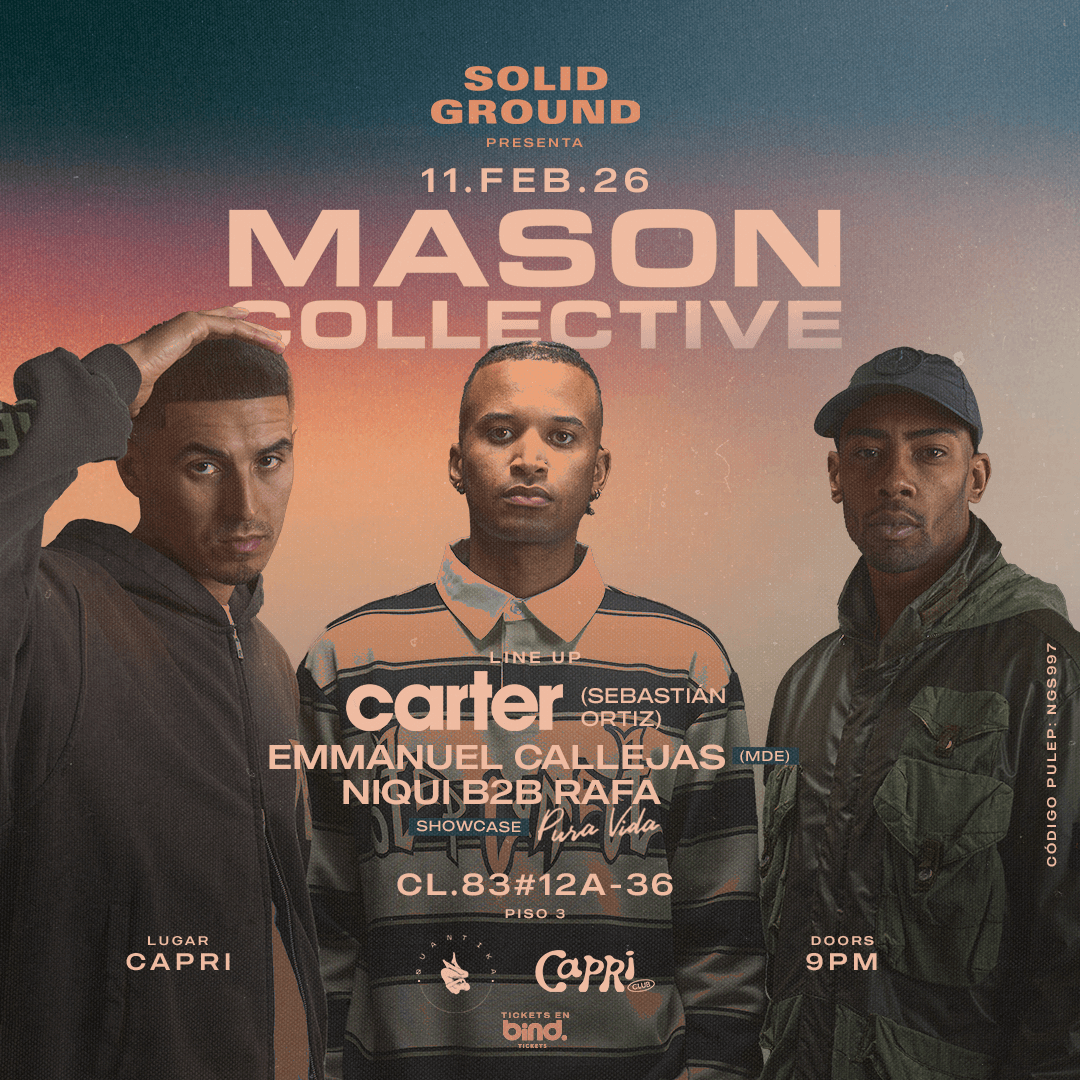 Este miércoles 11 de febrero desde las 9pm Capri y Solid Ground se toman el protagonismo con una curaduría enfocada en ritmo y carácter: Mason Collective lidera la noche con su sonido internacional, acompañados por Carter y Emanuel Callejas, y remata con un cruce de estilos en el B2B de Niqui y Rafa; una fecha para quienes buscan una noche con intención, selección precisa y un ambiente que se siente desde el primer drop.
